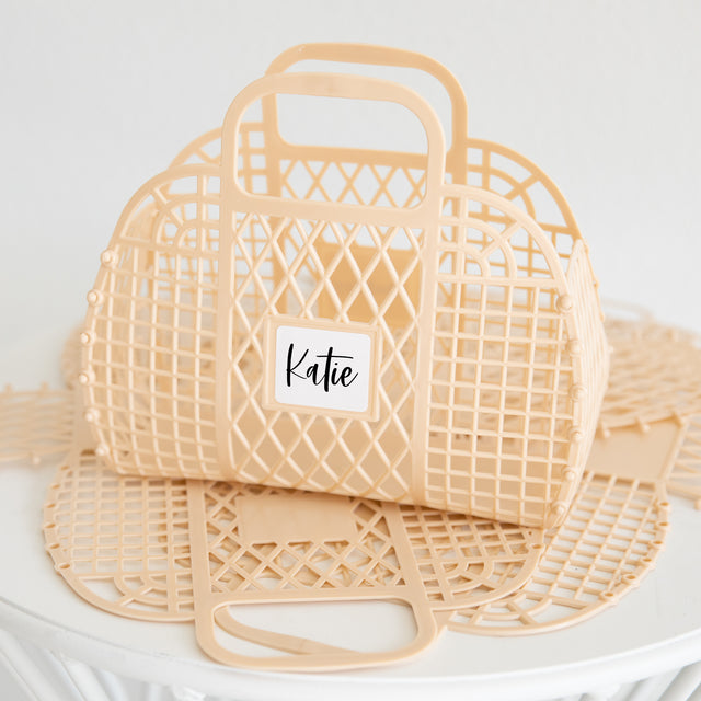 Retro style jelly bags are a perfect way to package your bachelorette gifts for your girls! Perfect for the bridesmaids to use as a small purse, beach bag and so much more. Fill your bags with a swimsuit, tumbler, beach towel, shades, and more from our store. Each beige bag is personalized with her name in a black script font. Please Note - this is a mini tote - view dimensions for exact size.