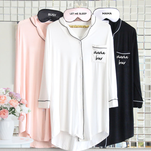 The New Mama to be Will Love Our Super Comfy Sleep Shirt for her Hospital Stay! Our Sleep Shirts Come in Black, White, and Blush - This Sleep Shirt is Printed with Mama Bear on the Pocket