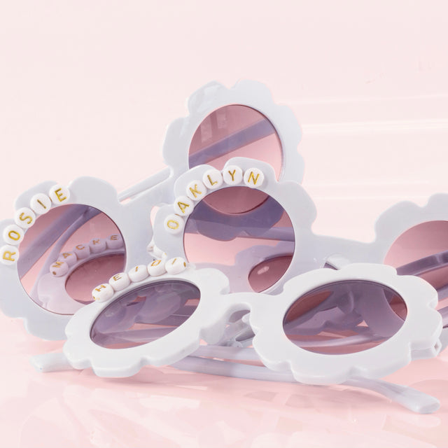 Personalized Flower Sunglasses For Girls are a Cute Gift Idea for the Flower Girl! She'll LOVE Having Her Name on Her Very Own Sunglasses! The Fun Floral Shape Fits Perfectly for the Flower Girl! Our Sunglasses are White in Color, Have the Flower Shaped Frame, Plastic Lens, and Hand Personalized with Letter Beads.